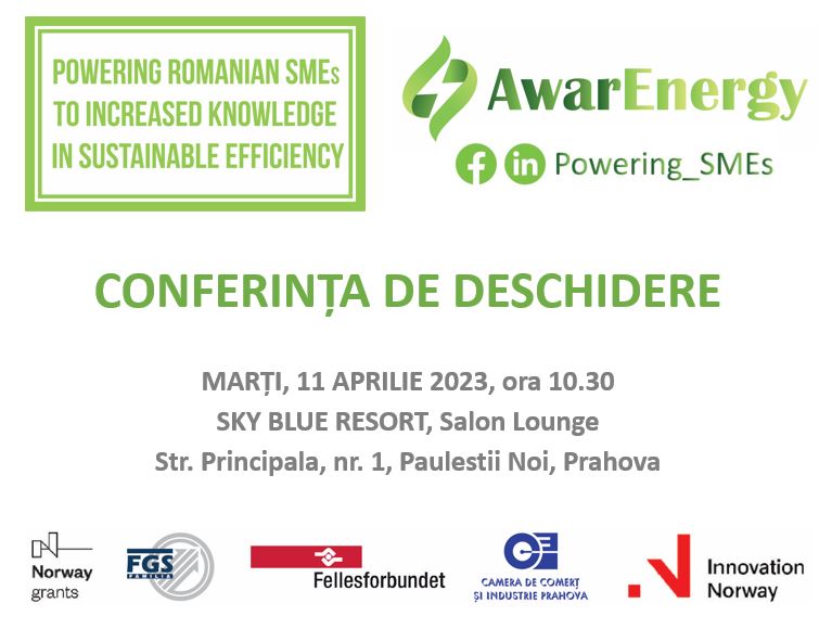 Avem deosebita plăcere să vă invităm să participați la conferința de deschidere a proiectului „Powering Romanian SMEs to Increased Knowledge in Sustainable Efficiency/Dinamizarea IMM-urilor din România, prin creșterea cunoștințelor în eficiență sustenabilă”, ID 2022/346631, finanțat cu sprijinul granturilor acordate prin mecanismul financiar norvegian 2014-2021 în cadrul „Programului de Energie din România”.