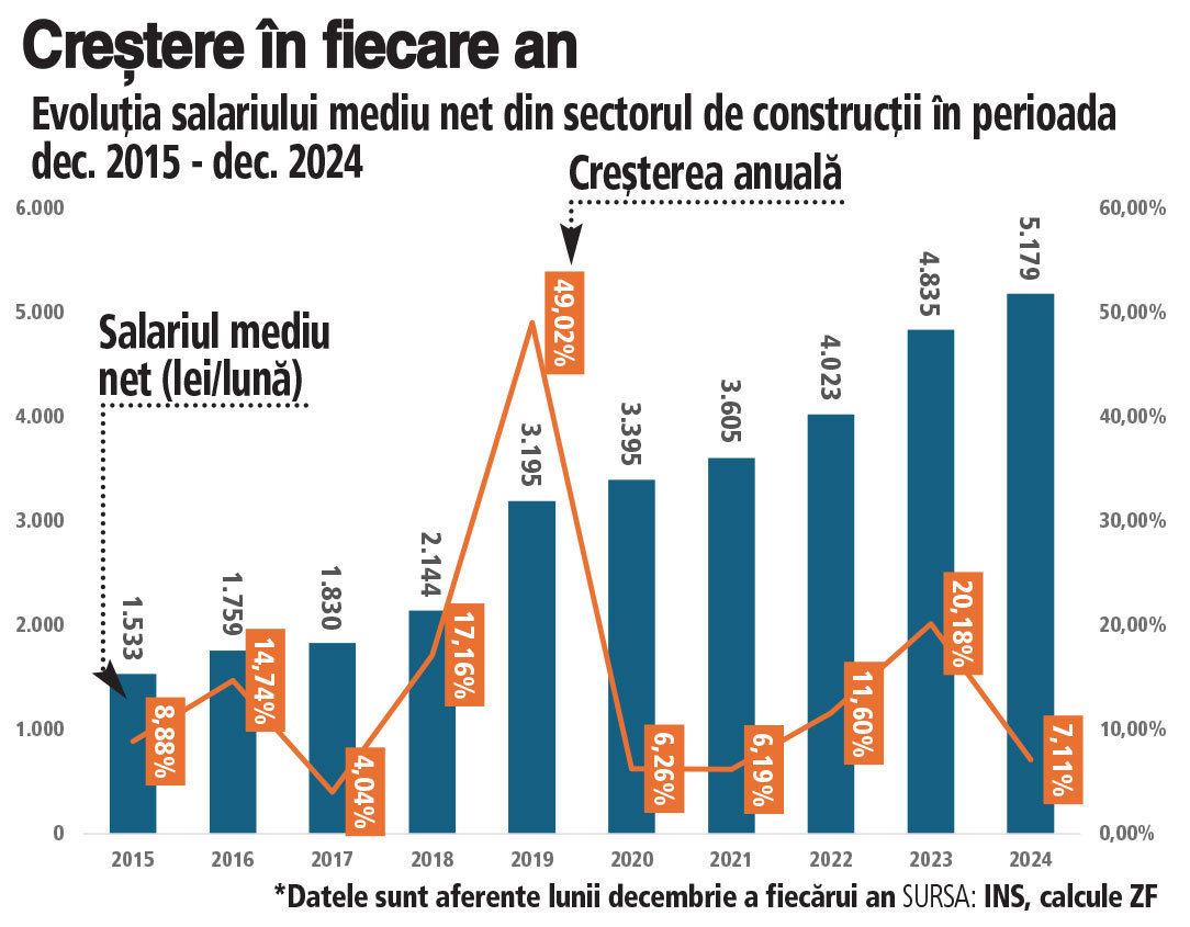 Scăderea față de luna precedentă se datorează, în mare parte, eliminării facilităților fiscale în anumite sectoare economice, printre care și cel din construcții. În ultimele zile din 2024, Guvernul a decis că începând cu data de 1 ianuarie 2025 să fie eliminată scutirea de impozit pe venit de 10% pentru veniturile salariale brute de până la 10.000 lei și contribuția la Pilonul ÎI de pensii pentru angajații din IT, construcții, agricultură și industria alimentară. Eliminarea scutirilor de impozit în IT, construcții, agricultură și industria alimentară a condus la scăderi salariale semnificative.