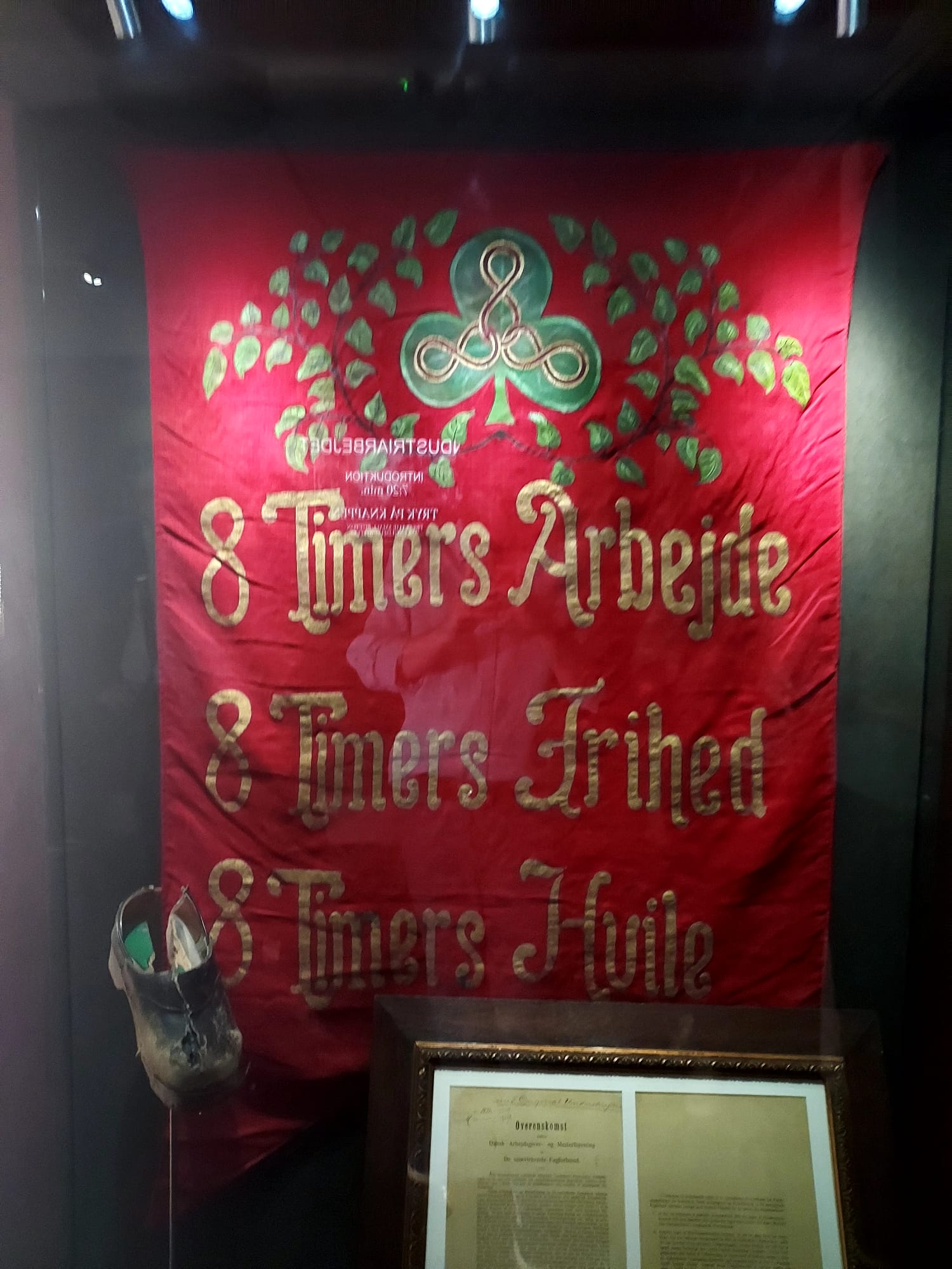 Poate unul din cele mai simbolice exponate este documentul prin care mișcarea sindicalistă și-a obținut recunoașterea, în urma "Marelui Conflict" din 1899, care a durat 5 luni. Acesta a fost un moment pivotal în istoria drepturilor muncitorilor din Danemarca, stabilind baza pentru modelul de dialog social danez. O adevărată constituție fondatoare a drepturilor lucrătorilor, actul este expus lângă un bocanc găurit și un steag sindicalist (trifoiul cu 3 foi în formă de 8, simbolizând echilibrul dintre muncă și viața privată, cu câte 8 ore pentru muncă, odihnă și viața personală).