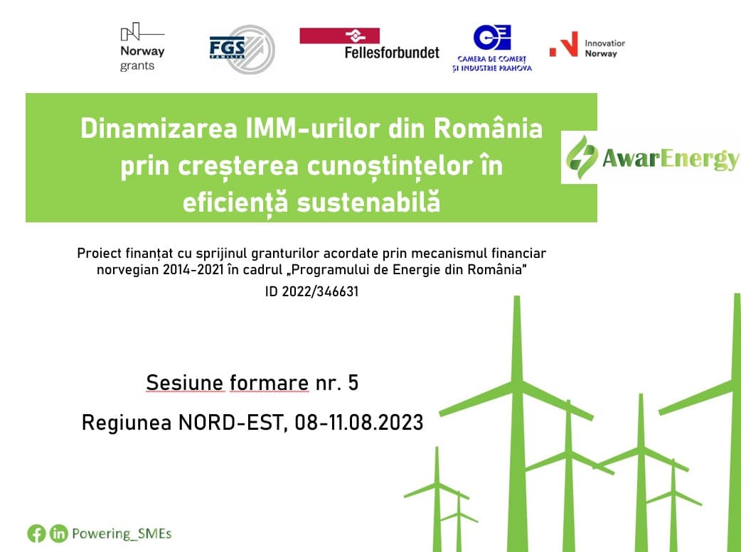 În perioada 07-10 august 2023 s-a derulat, în format online, cea de-a cincea sesiune de formare ce are drept obiectiv creșterea de conștientizare în domeniul energiei regenerabile, eficienței și securității energetice, realizată în cadrul proiectului „Powering Romanian SMEs to Increased Knowledge in Sustainable Efficiency/Dinamizarea IMM-urilor din România, prin creșterea cunoștințelor în eficiență sustenabilă”, ID 346631.